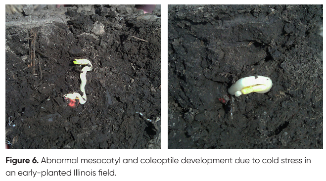 Early planting often exposes seeds to hydration with cold water, which can cause direct physical damage. When the dry seed imbibes cold water as a result of a cold rain or melting snow, imbibitional chilling injury may result. The cell membranes of the seed lack fluidity at low temperatures, and under these conditions, the hydration process can result in rupture of the membranes. Cell contents then leak through this rupture and provide a food source for invading pathogens. Cold water can similarly affect seedling structures as they begin to emerge. The degree of damage ranges from seed death to abnormalities such as corkscrews or fused coleoptiles (Figure 6).