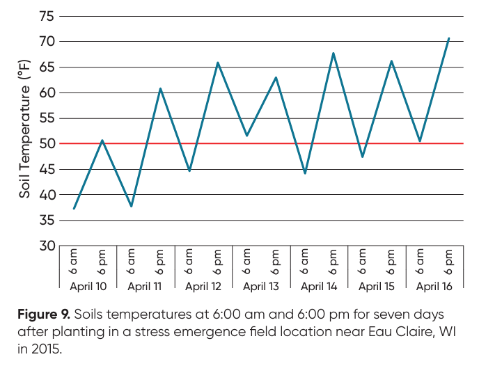In 2015, soil temperatures were recorded at a 2-inch depth at a research location with sandy soils near Eau Claire, WI. Daytime soil temperatures reached acceptable levels for corn development (over 50°F) for the first week after planting. However, the early morning soil temperatures dipped to as low as 38°F, and on some days the soil temperature difference between 6 AM and 6 PM was over 20°F (Figure 8). An average 16% stand loss was observed at this location, suggesting that day-night temperature fluctuation after planting can cause added stress to germinating corn. Farmers should be aware of expected night temperatures when choosing a planting date.